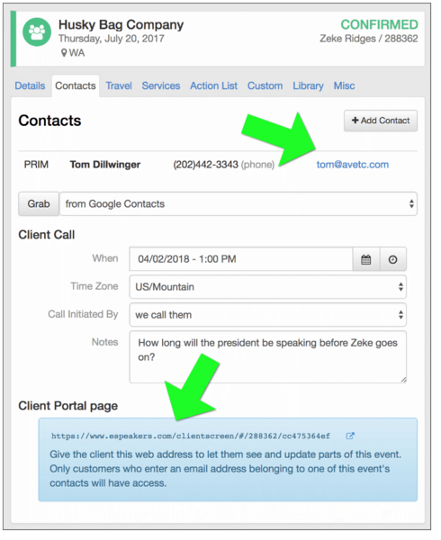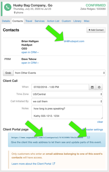On the CONTACTS tab, find the CLIENT PORTAL section and note the unique URL. Each of your events has a special distinct URL that you give the client to open in their web browser.