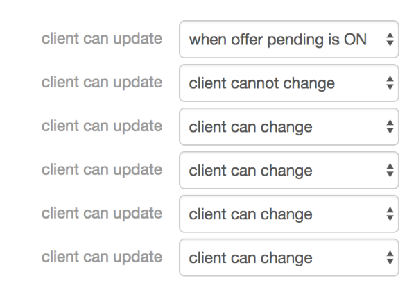 WHEN OFFER PENDING IS ON - the customer will be able to change this field if the OFFER PENDING checkbox is ON. If the OFFER PENDING checkbox is OFF, the client will not be able to make changes to the field. Use this when you want the client to be able to make updates while you're in negotiations ("offer pending"), but once the contract is signed (uncheck "offer pending") you do not want them to be able to make changes to that field.