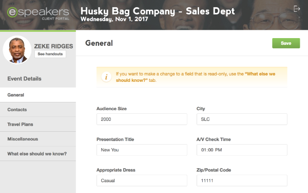 Delight your customers and minimize admin busywork when you give your clients a real-time window to their own event. Your eSpeakers Client Portal lets customers see basic event details, travel plans, and event-related contacts. If you allow the client to make updates, those updates go directly into your event management application (EventCX) and you're notified instantly of exactly what was changed.