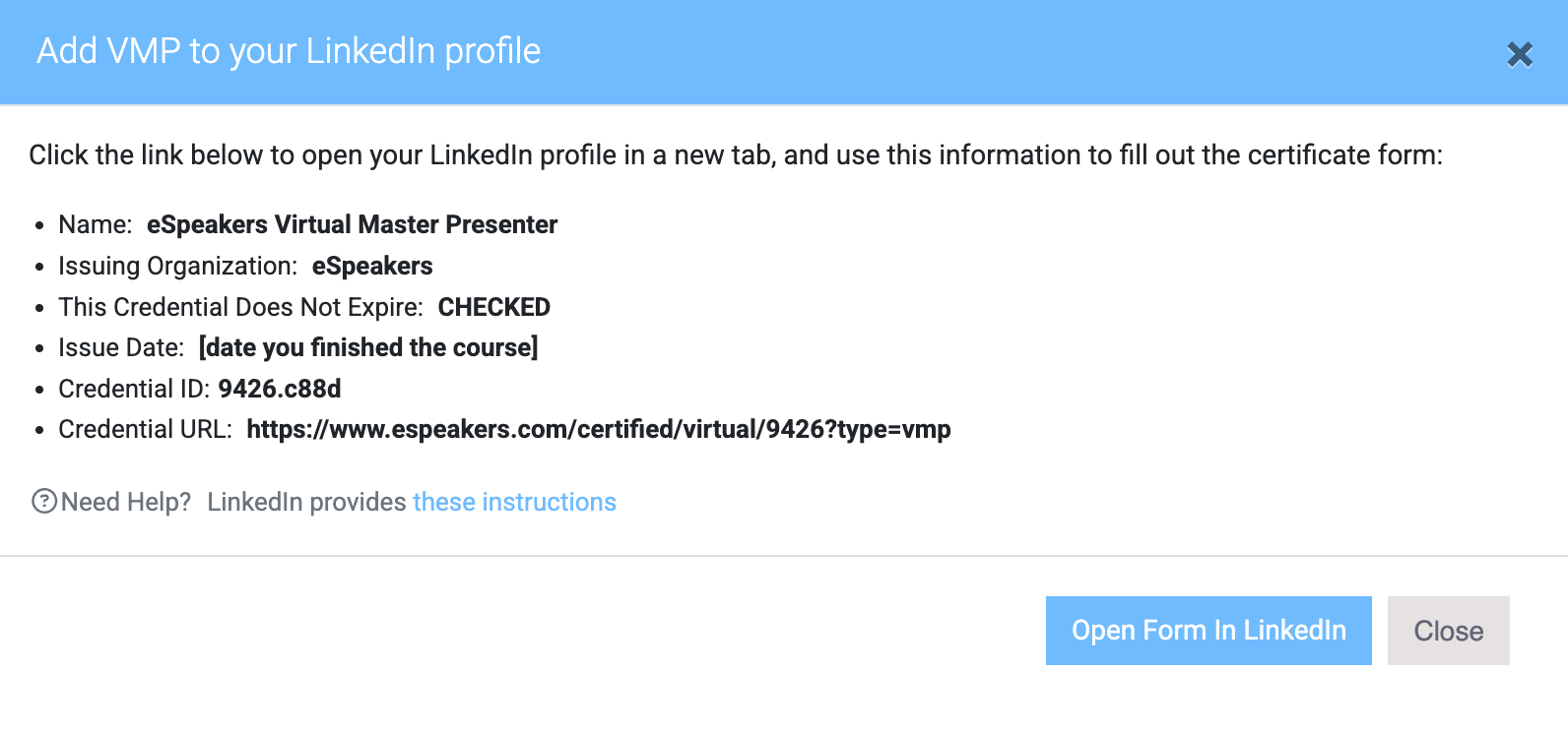 - On the window that appears, note the information you'll need in the next step, then click OPEN FORM IN LINKEDIN to complete the process on the LinkedIn site.