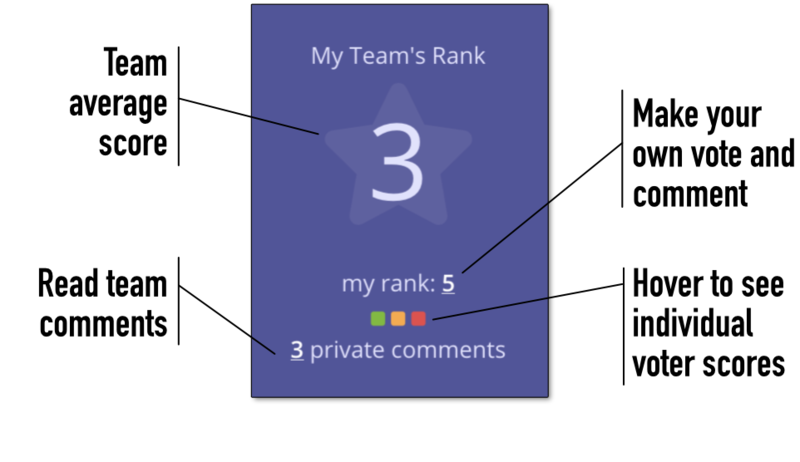 The small colored boxes are a quick way for you to gauge the temperature of the group's response. Red boxes graduate through the color spectrum toward green to indicate a low to a high ranking by each. If four team members have voted on a speaker, you'll see four boxes. Hover over the boxes or click them to see more details.
